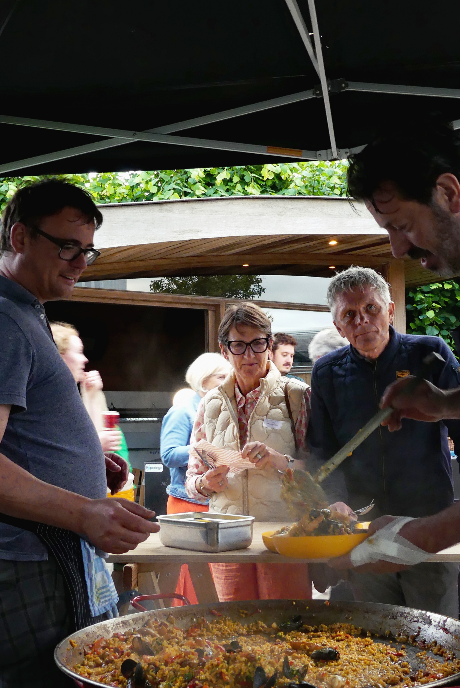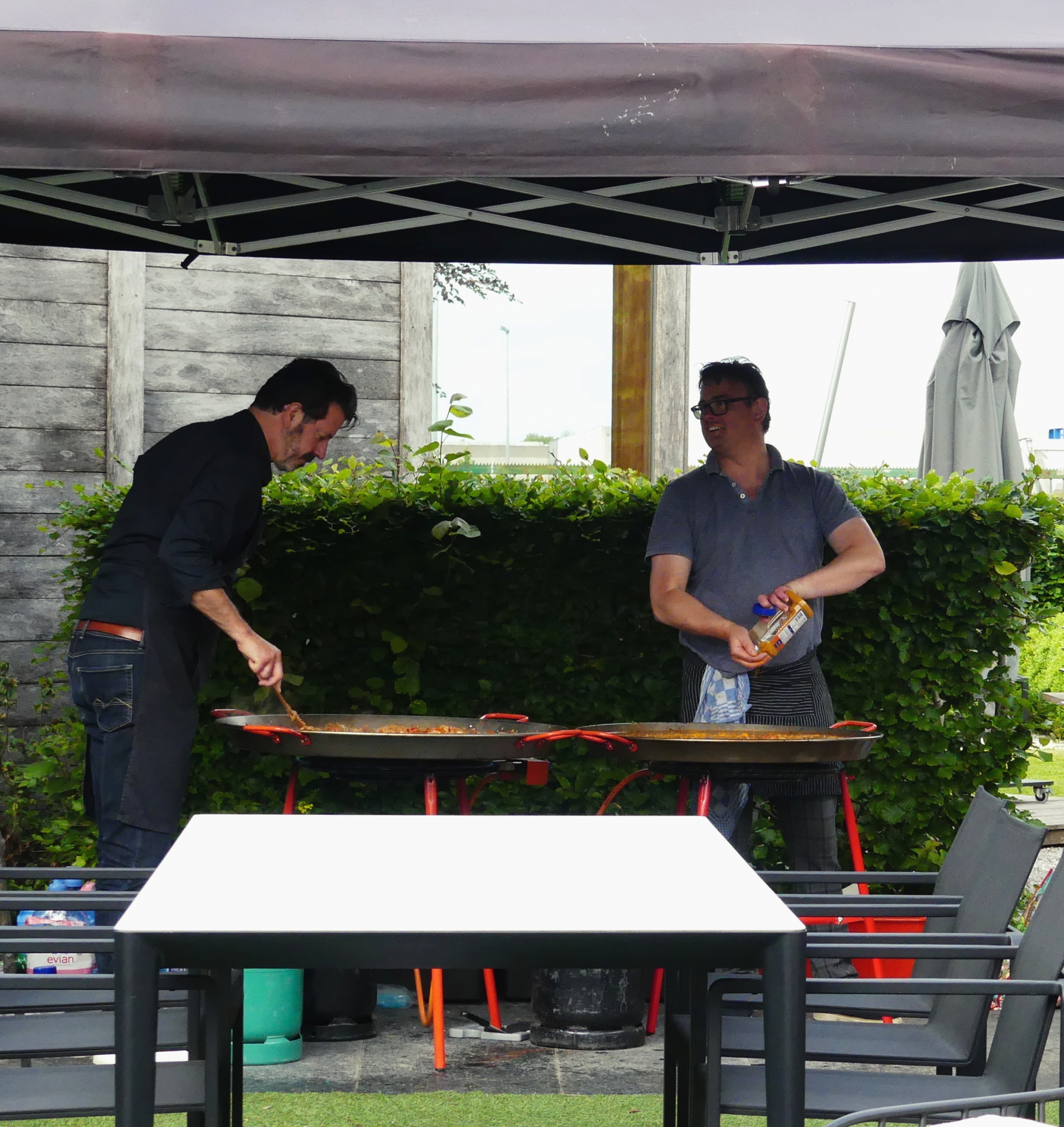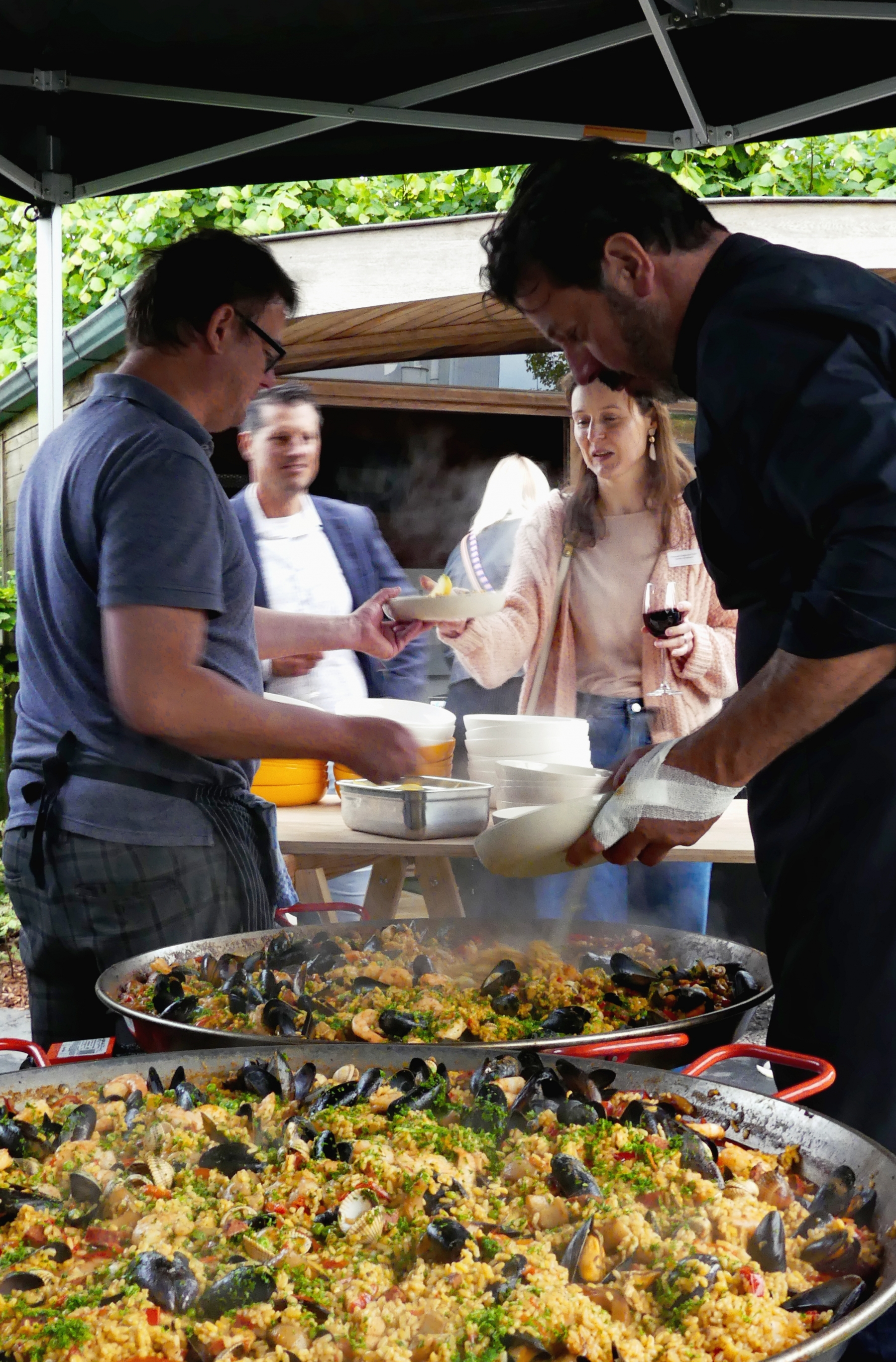 Terwijl de gasten een blik achter de schermen kregen, bereidden koks Wannes en Dieter verse paella in de tuin. De geur van de paella begon zich te verspreiden, tijd om aan te schuiven! De rest van de avond stond in het teken van ‘togetherness’ –om het in de woorden van Extremis te zeggen– Napraten en netwerken in een gezellige en gemoedelijke sfeer aan het mooie meubilair van Extremis.