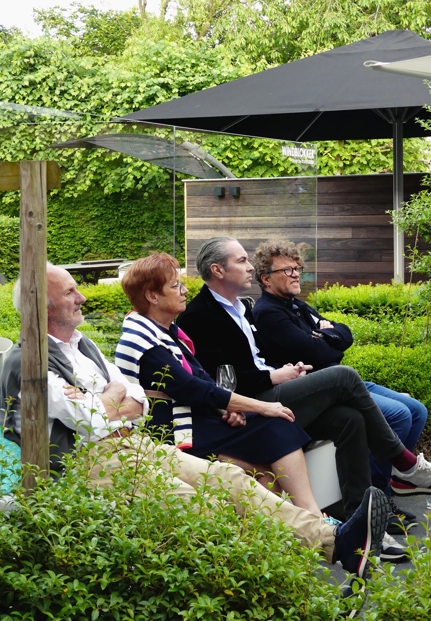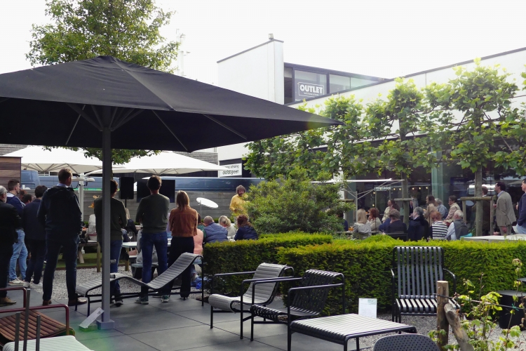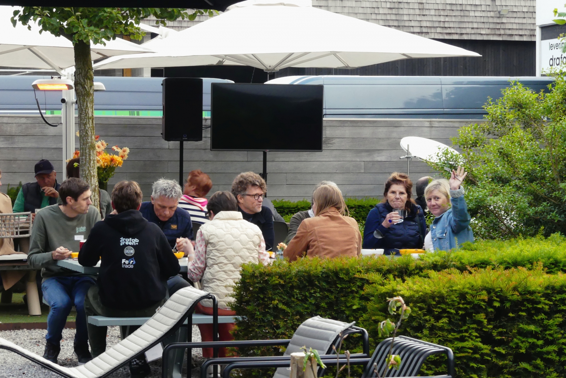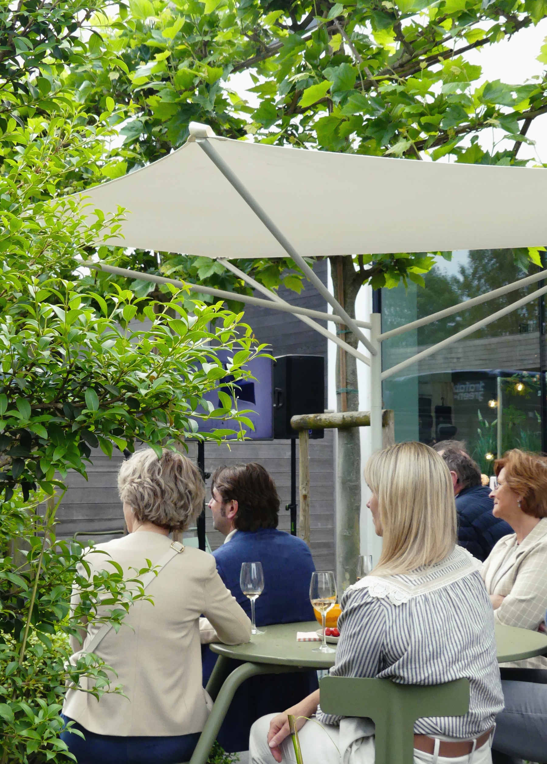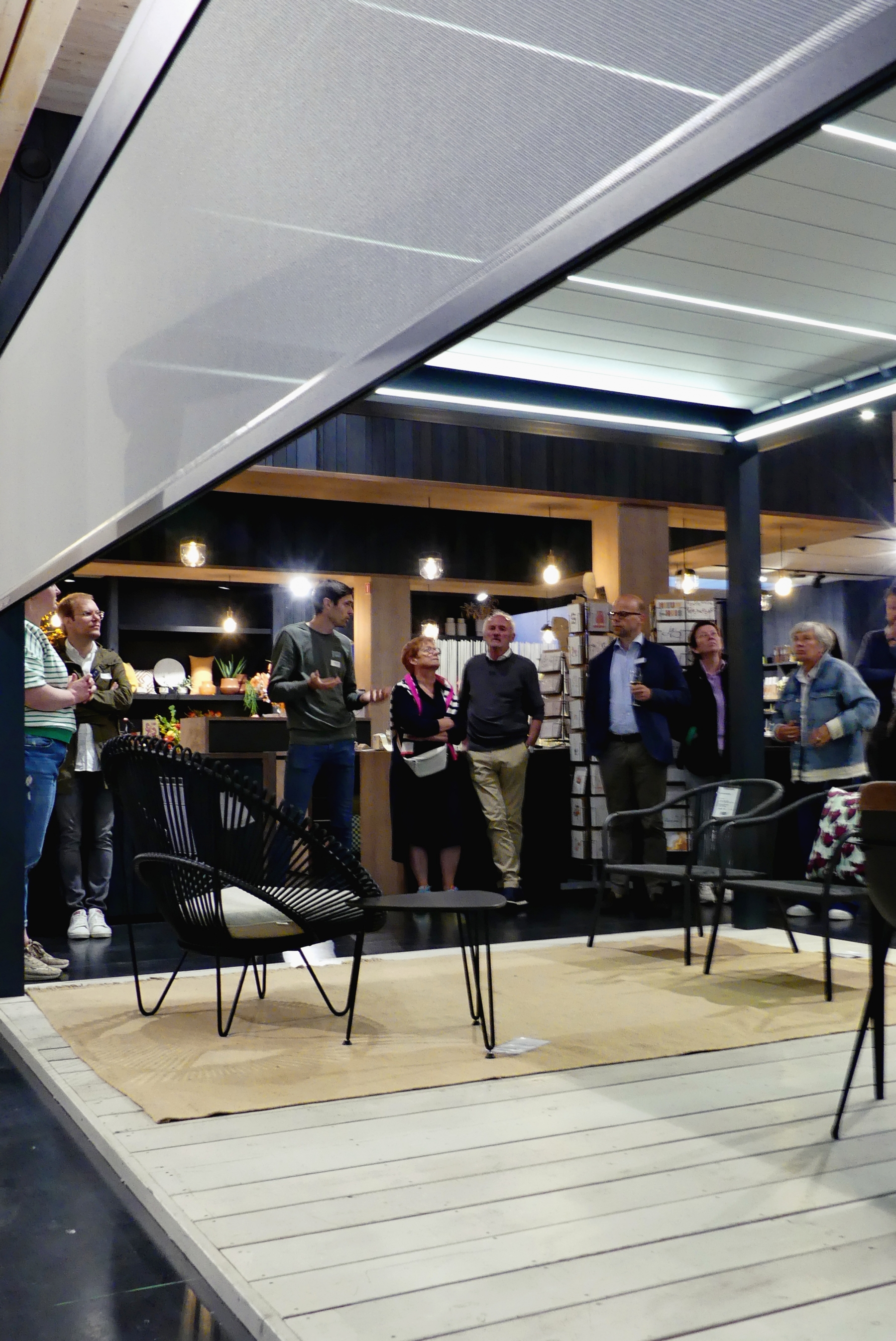 Vervolgens werden de gasten meegenomen voor een rondleiding door de winkel en het atelier van drafabGREEN. De eerste stop was de vernieuwde inspiratietuin vooraan de winkel, die begin dit jaar werd aangevuld met enkele tuinconstructies. In het atelier kregen de gasten een uitgebreide uitleg over de Windblokker, een mobiel windscherm ontworpen door drafabGREEN. Tijdens de rondleiding maakten we ook een tussenstop bij de Brustor terrasoverkapping, waar het brede aanbod schaduwoplossingen werd besproken.