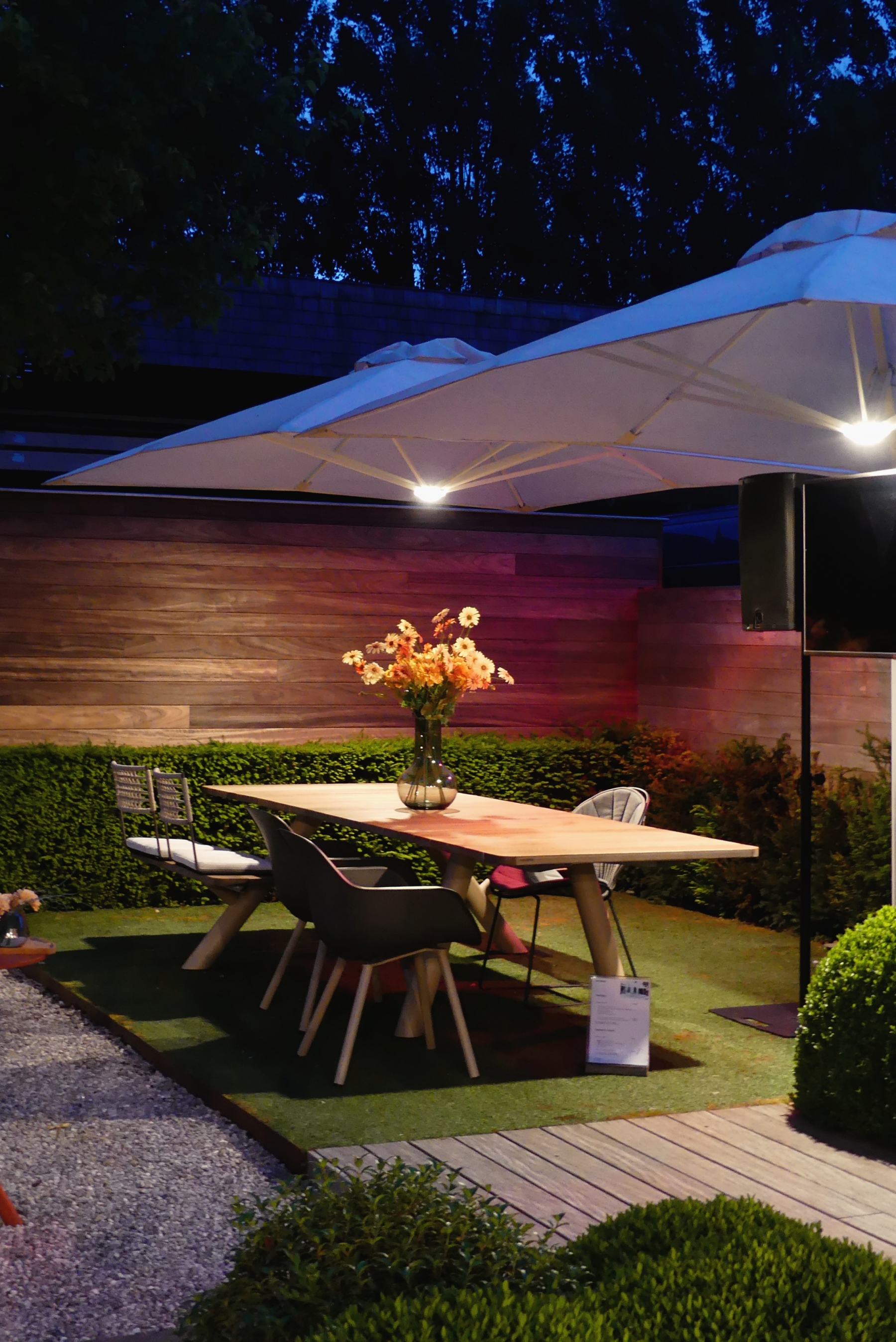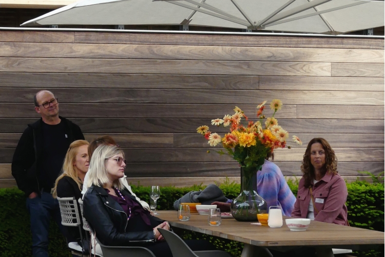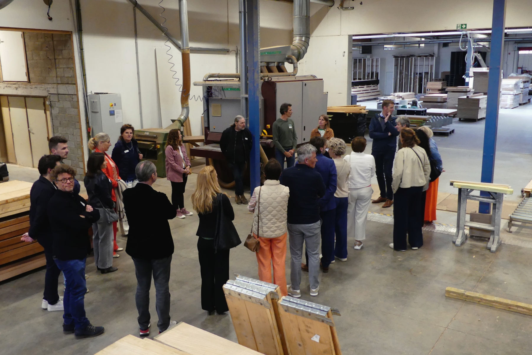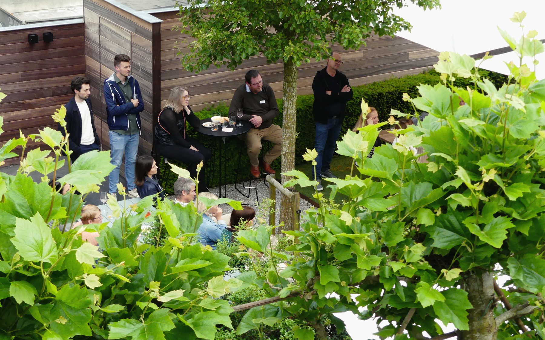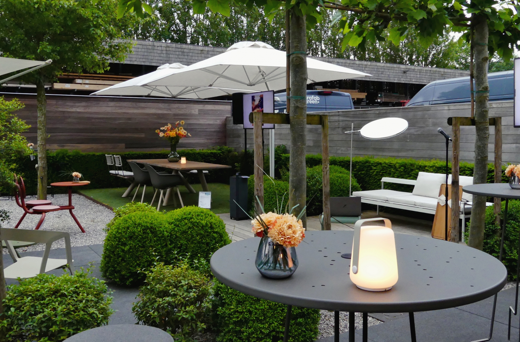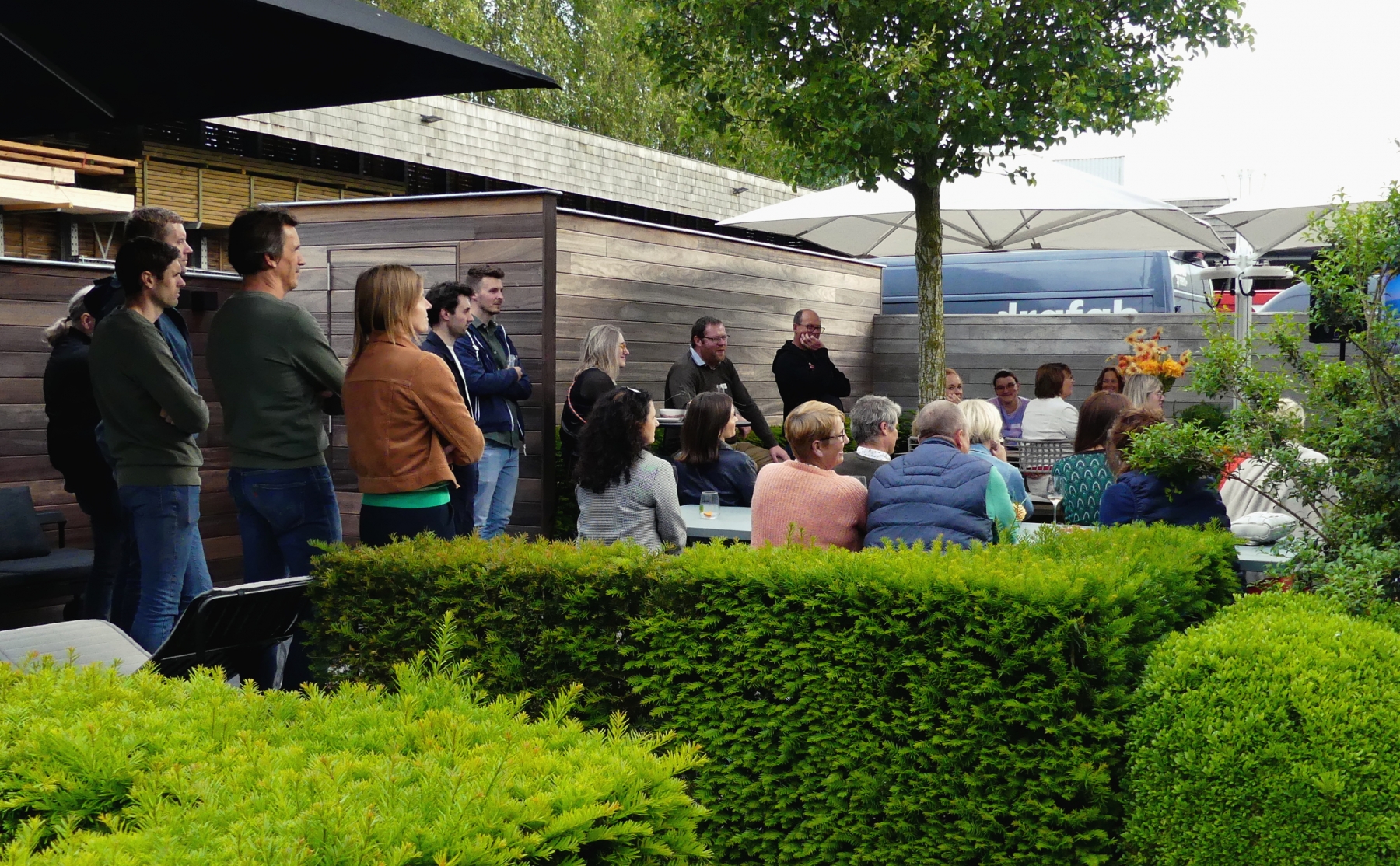 Vervolgens werden de gasten meegenomen voor een rondleiding door de winkel en het atelier van drafabGREEN. De eerste stop was de vernieuwde inspiratietuin vooraan de winkel, die begin dit jaar werd aangevuld met enkele tuinconstructies. In het atelier kregen de gasten een uitgebreide uitleg over de Windblokker, een mobiel windscherm ontworpen door drafabGREEN. Tijdens de rondleiding maakten we ook een tussenstop bij de Brustor terrasoverkapping, waar het brede aanbod schaduwoplossingen werd besproken.