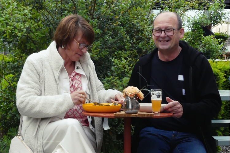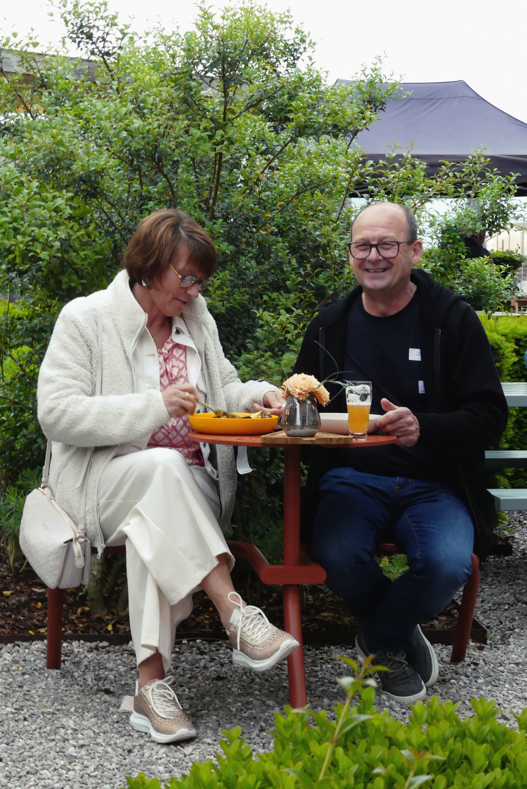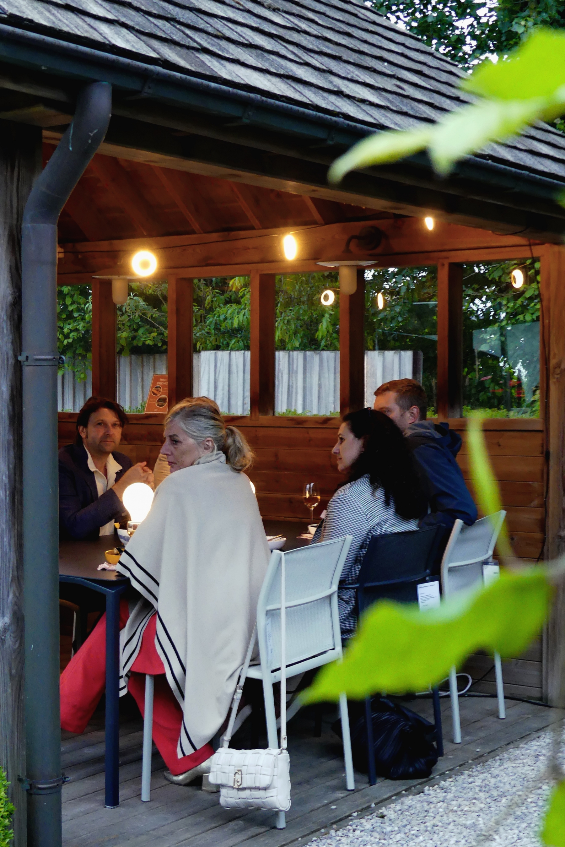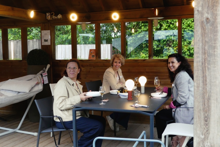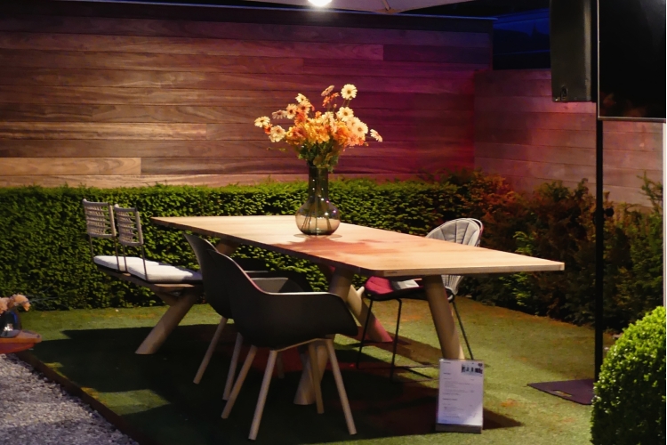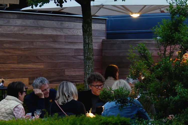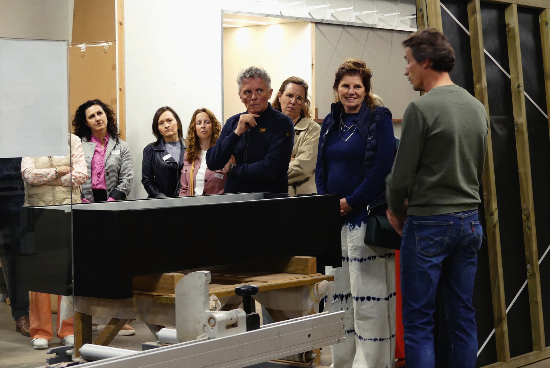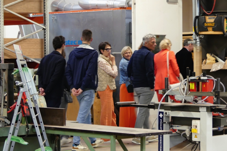 Vervolgens werden de gasten meegenomen voor een rondleiding door de winkel en het atelier van drafabGREEN. De eerste stop was de vernieuwde inspiratietuin vooraan de winkel, die begin dit jaar werd aangevuld met enkele tuinconstructies. In het atelier kregen de gasten een uitgebreide uitleg over de Windblokker, een mobiel windscherm ontworpen door drafabGREEN. Tijdens de rondleiding maakten we ook een tussenstop bij de Brustor terrasoverkapping, waar het brede aanbod schaduwoplossingen werd besproken.