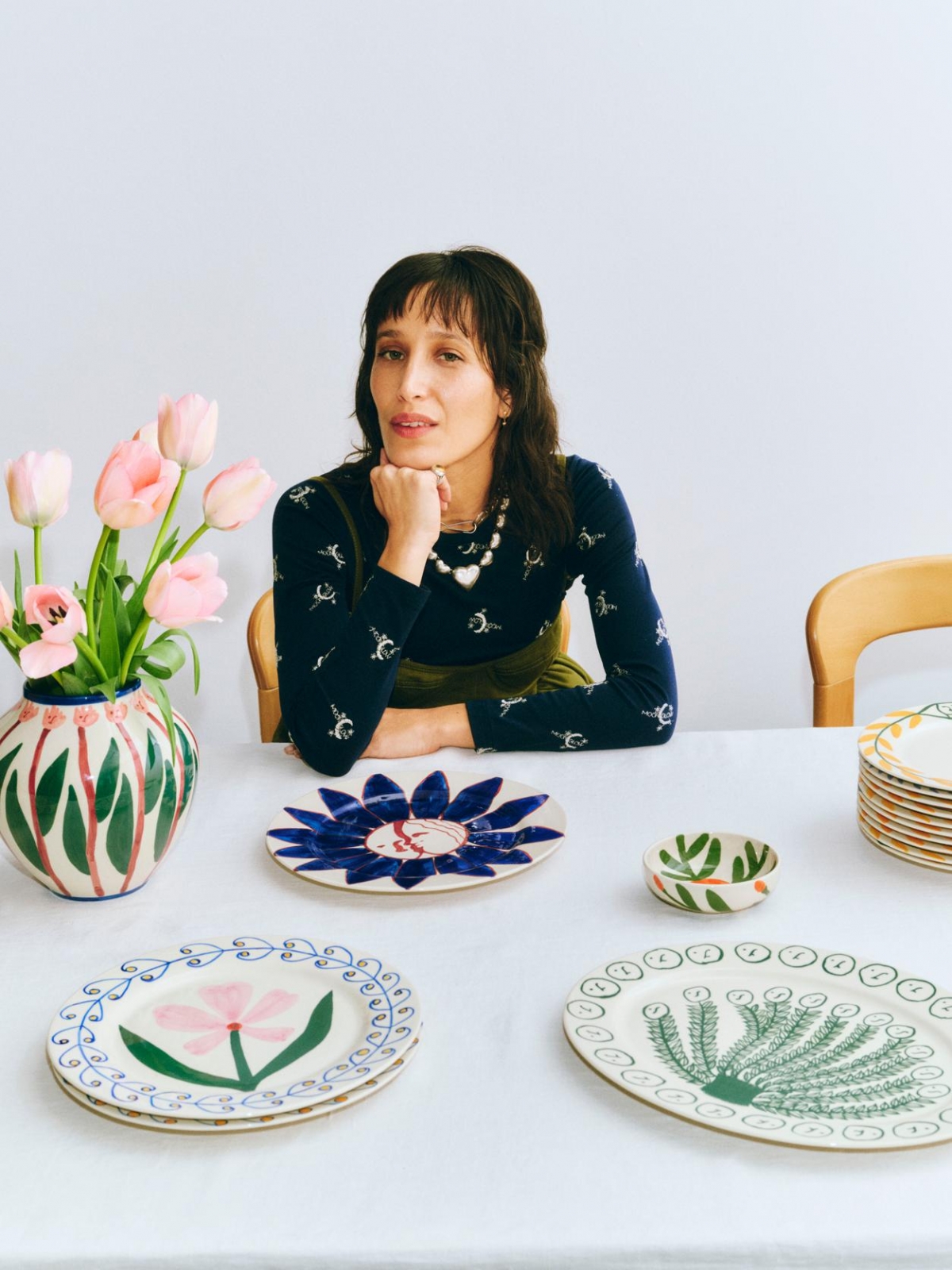 De collectie bestaat uit schalen, borden, karaffen en onderleggers die niet alleen perfect functioneren als servies, maar ook moeiteloos hun plek vinden als decoratieve objecten in huis. Wat direct opvalt is de herkenbare stijl van Emma Kohlmann: expressief, kunstzinnig en levendig. Toch heeft elk bord en elk stuk binnen de collectie een eigen karakter, waardoor samen een verrassend geheel ontstaat.