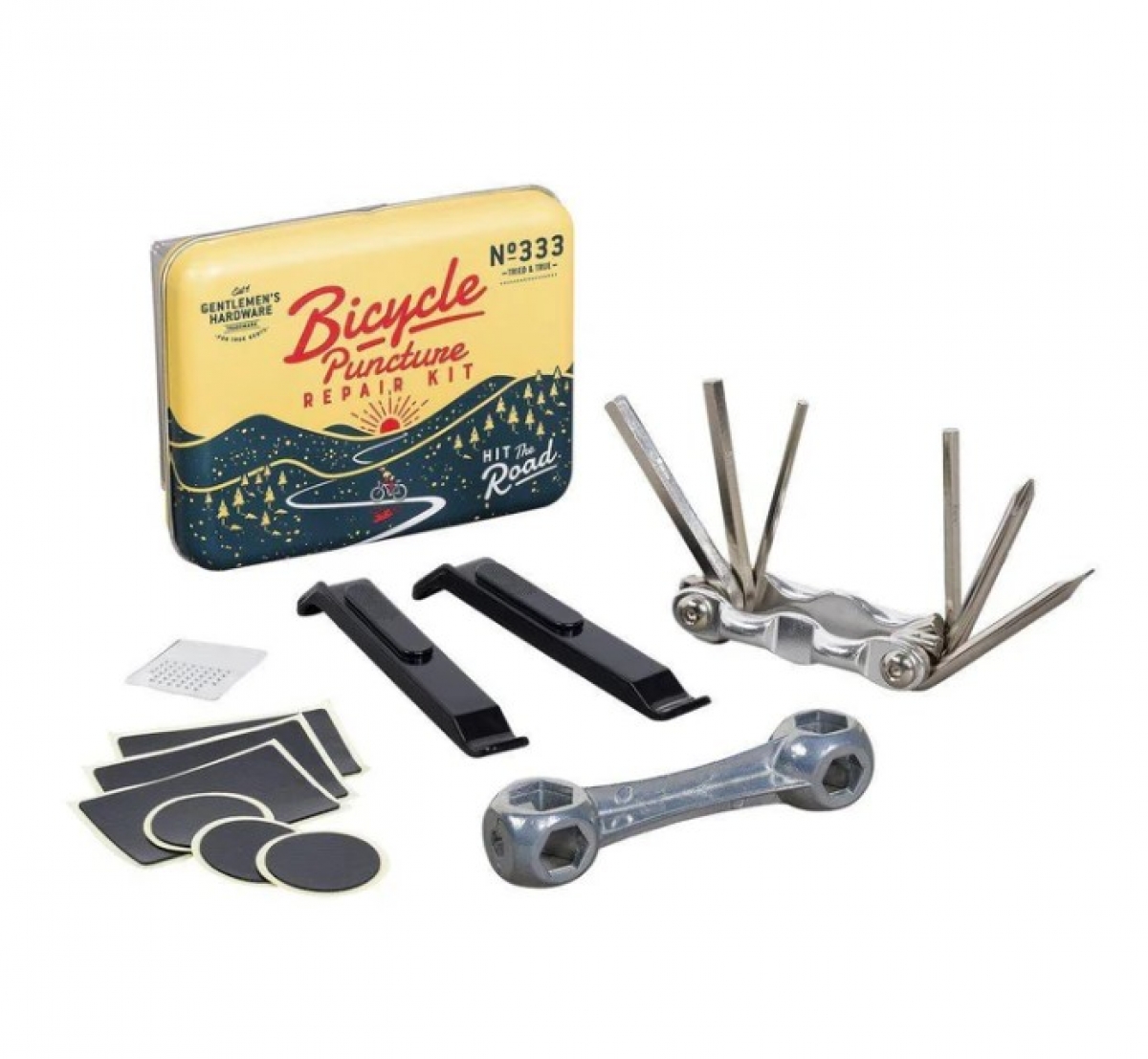 Elke fietser heeft een betrouwbare Puncture Repair Kit nodig, en die van Gentlemen’s Hardware stelt niet teleur. Deze complete set bevat een botsleutel, rasp, multifunctioneel gereedschap, 6 zelfklevende reparatiepatches, 2 kunststof bandenlichters en handleiding, netjes verpakt in een stijlvol doosje.