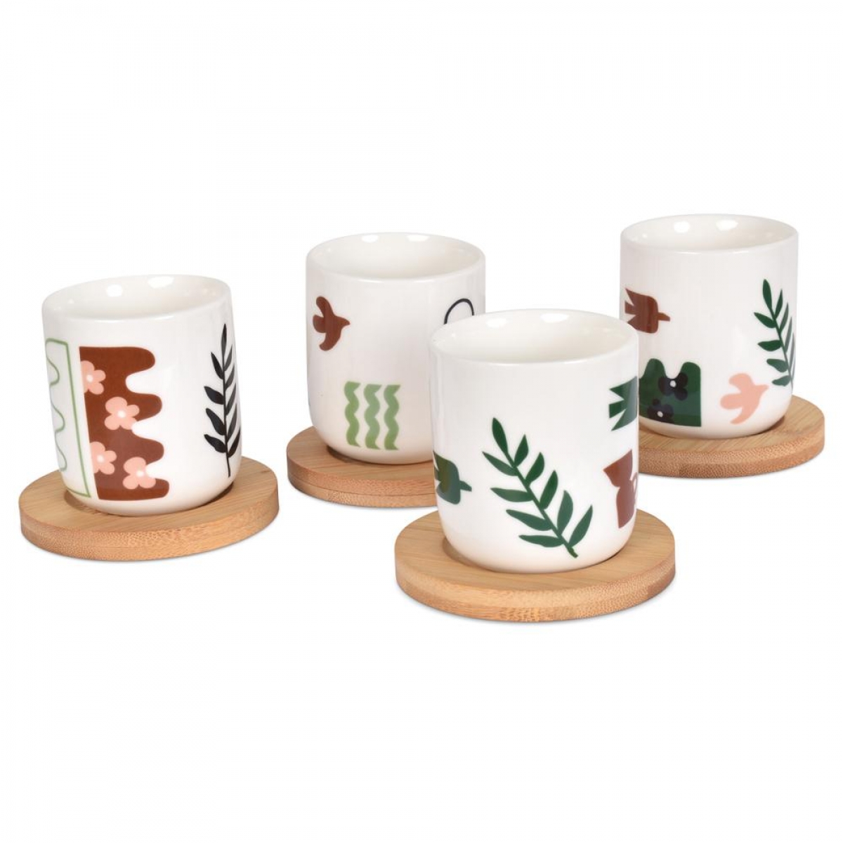 Set van 4 mokken met bamboe onderzetter, een ideaal geschenkje.