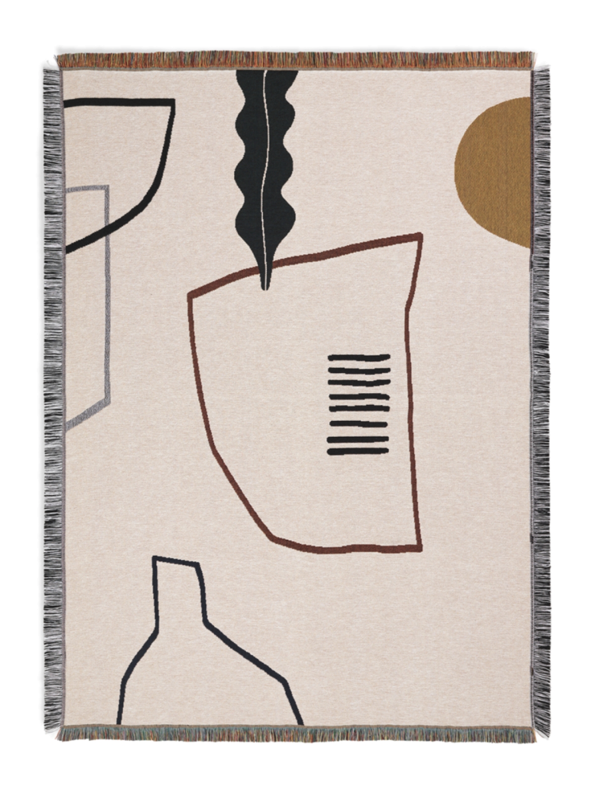 Dit Mirage deken van Ferm Living ziet er fantastisch uit! Op het deken, die ook kan gebruikt worden als wandtapijt, komen lijnen samen in abstracte vormen die doen denken aan oases en woestijnen.