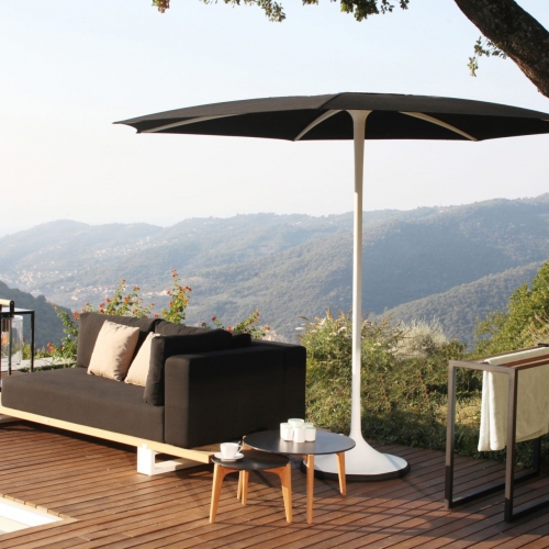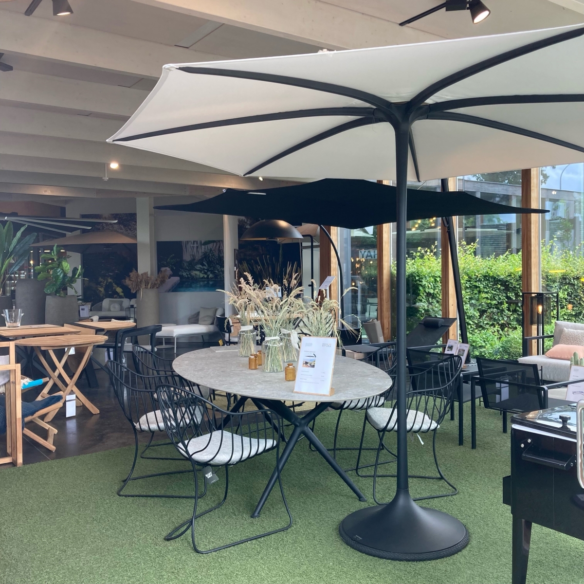 Palma is de eerste automatische parasol binnen de markt. Het mechanisme is verwerkt in de mast waardoor je de parasol met gemak kan openen en terug sluiten. De parasol heeft een diameter van 300 cm en heeft heel wat mogelijkheden qua kleuren (zowel mast als doek). Let ook op de parasolvoet. Deze gaat naadloos over in de parasolmast, en kan op de rubberen ring makkelijk gedraaid worden over terras of gras.