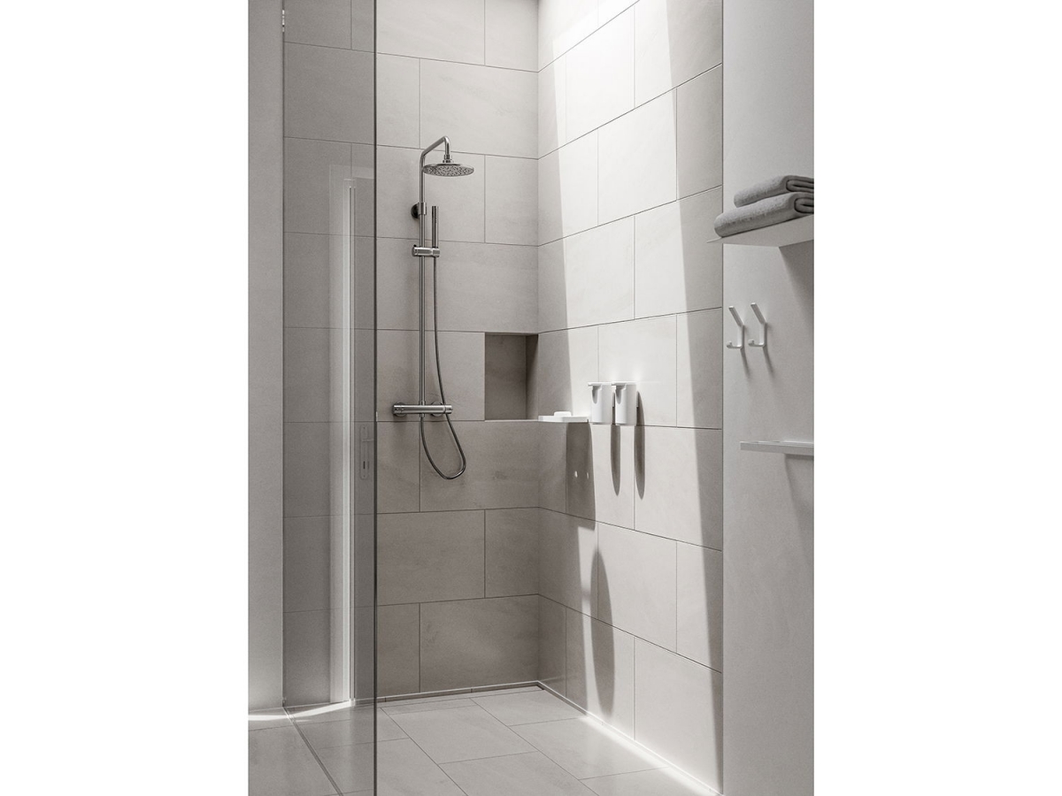 Het Rim doucheplankje van Zone Denmark. Eenvoudig te monteren, voorzien van een uitneembaar inlegplankje voor moeiteloze reiniging en een sleuf voor optimale waterafvoer. Stijlvol, functioneel en perfect voor elke moderne badkamer.
