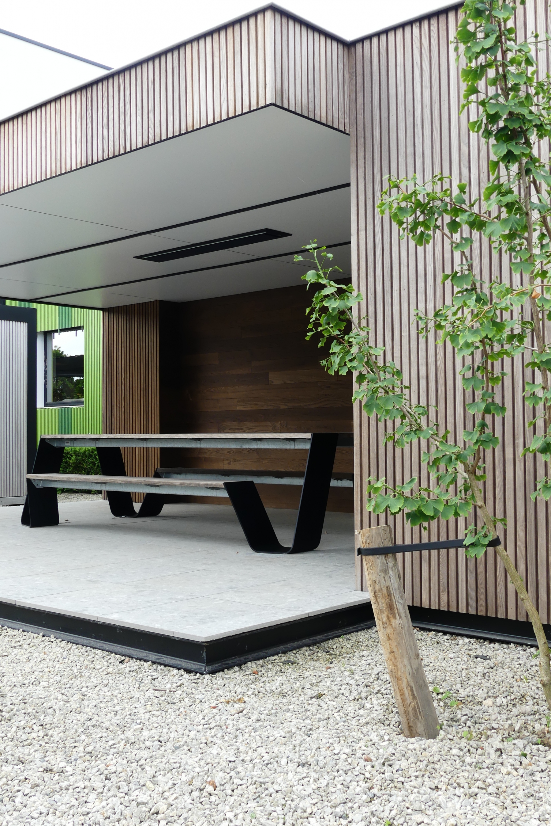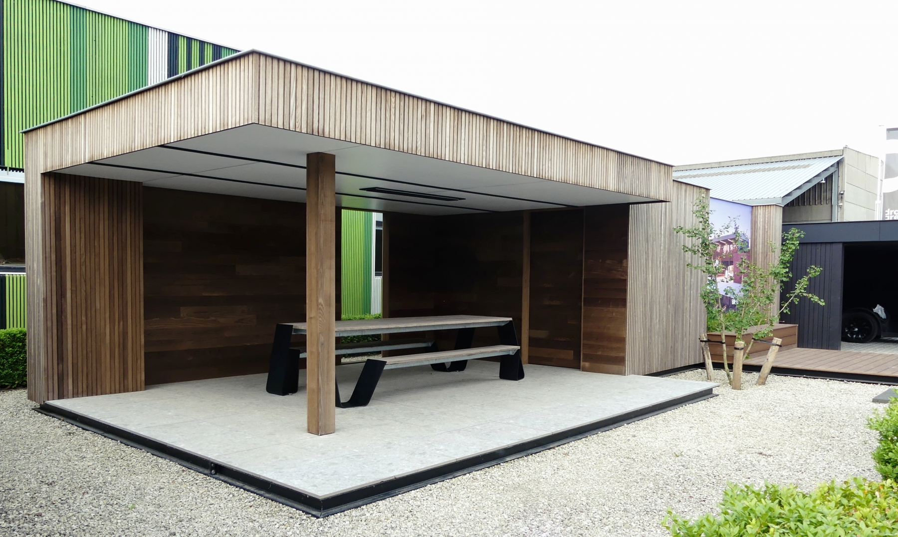 Onze recent toegevoegde constructies in de expotuin belichamen het vakmanschap en de veelzijdigheid waar drafabGREEN voor staat. Een bijzonder pronkstuk is de ruime poolhouse met berging, een eigen ontwerp dat volledig bestaat uit maatwerk.