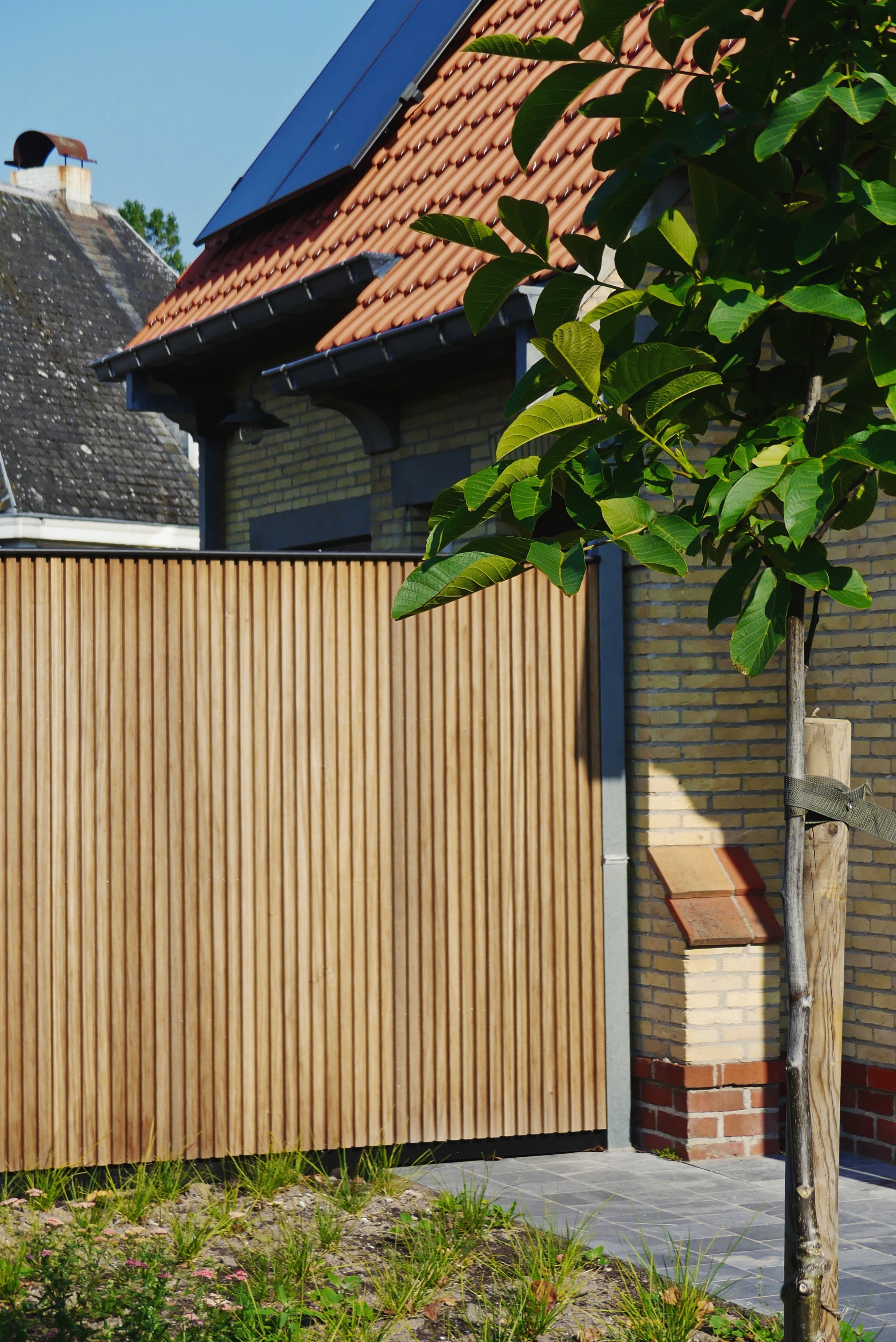 Aan de andere kant van deze woning werd een tuinwand geïnstalleerd die de tuin afschermt van de buitenwereld. Deze wand is in dezelfde stijl afgewerkt als de tuinberging, waardoor er een mooi en samenhangend geheel ontstaat. Onderaan de tuinwand is een volkern plint aangebracht, een subtiel maar elegant detail dat niet alleen de duurzaamheid van de constructie verbetert, maar ook een extra visueel accent toevoegt.