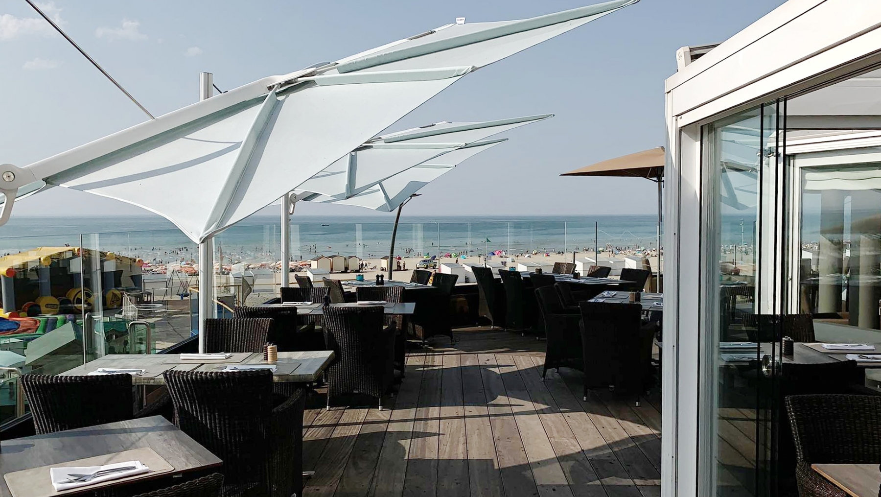 Het terras van restaurant De Witte Berg op de zeedijk van De Panne is een idyllisch plekje. Vanop het terras kun je ’s avonds genieten van de prachtige zonsondergang. Overdag zorgen de Spectra parasols van Umbrosa voor schaduw. Door de Spectra te kantelen word je zowel bij hoge als bij lage zon uit de zon gezet.