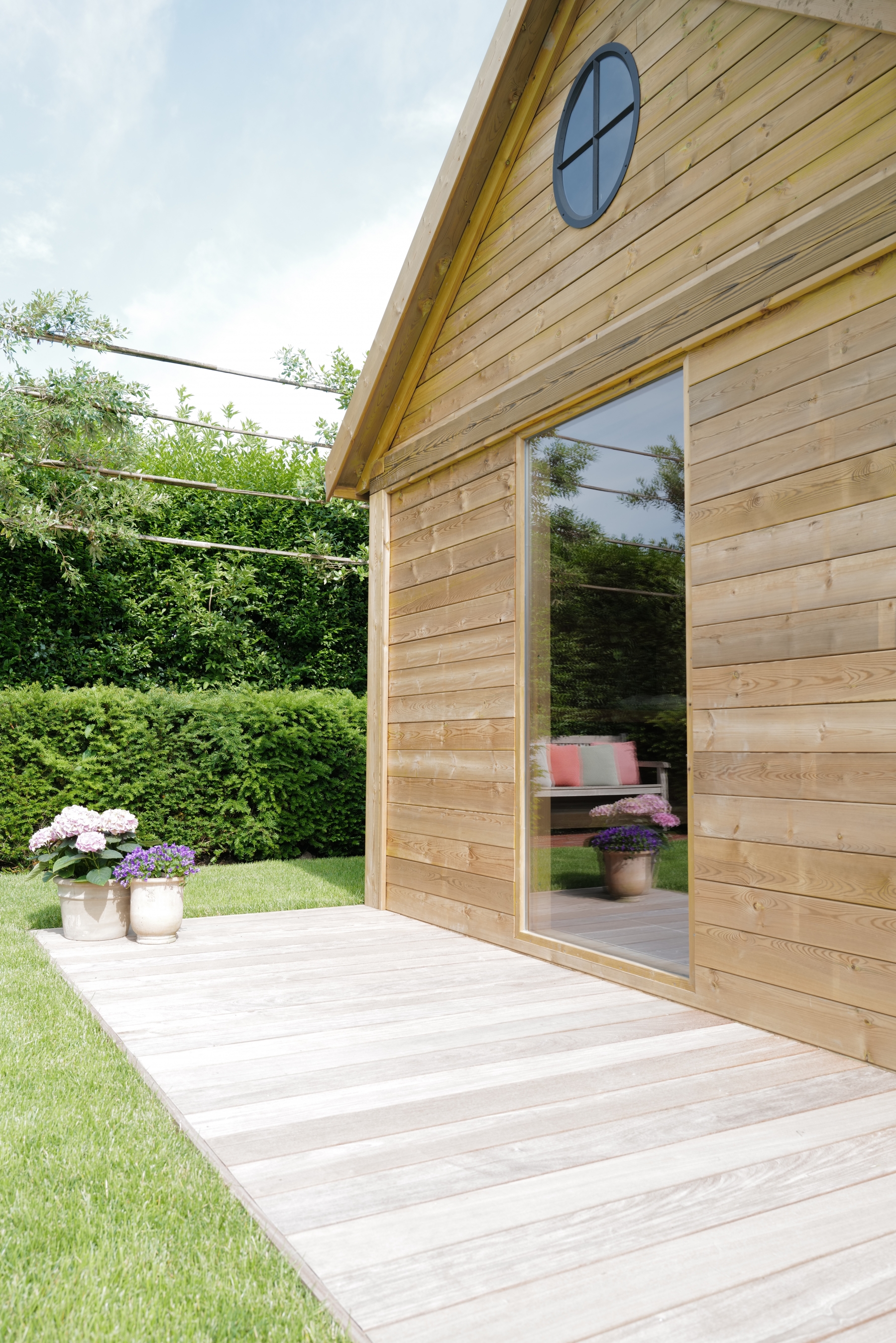 Deze stijlvolle poolhouse van Collstrop is ideaal om op elk moment van de dag in de tuin te genieten. Weer of geen weer, onder het overdekte terras zit je steeds beschut. De poolhouse is voorzien van een afsluitbare berging. Bij onze klant in Ieper hebben wij in deze ruimte een sauna in cederhout voorzien.