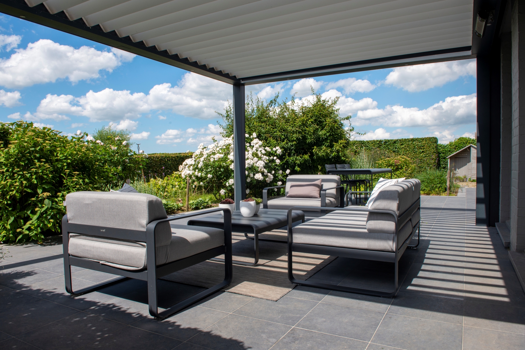 Voor de lounge meubels werd gekozen voor het anthraciet grijze "Carbon" van Fermob, dat mooi aansluit bij de kleur van de terrasoverkapping.